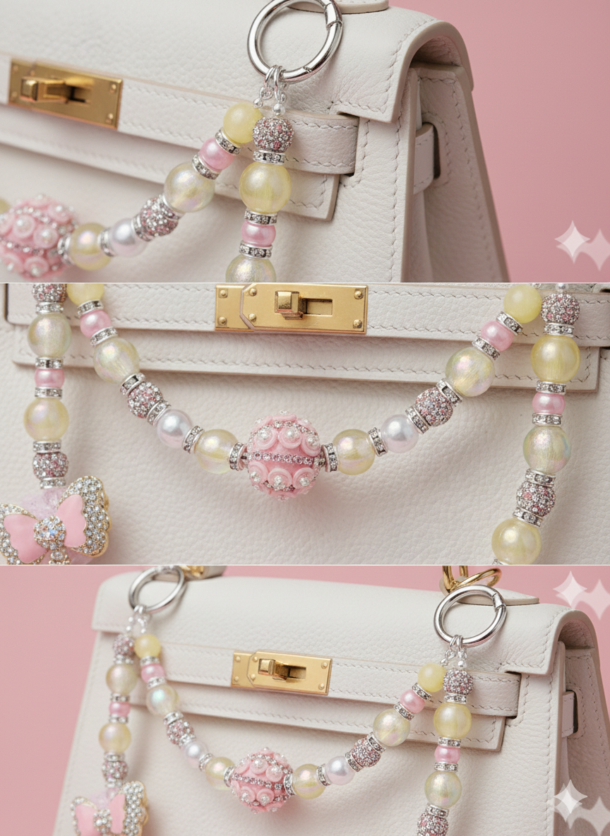 Pastel Pearl Drip: Luxurious double-strand bag jewelry with elegant pearls and pastel pink and yellow crystal beads. A chic, custom addition to your favorite handbag.