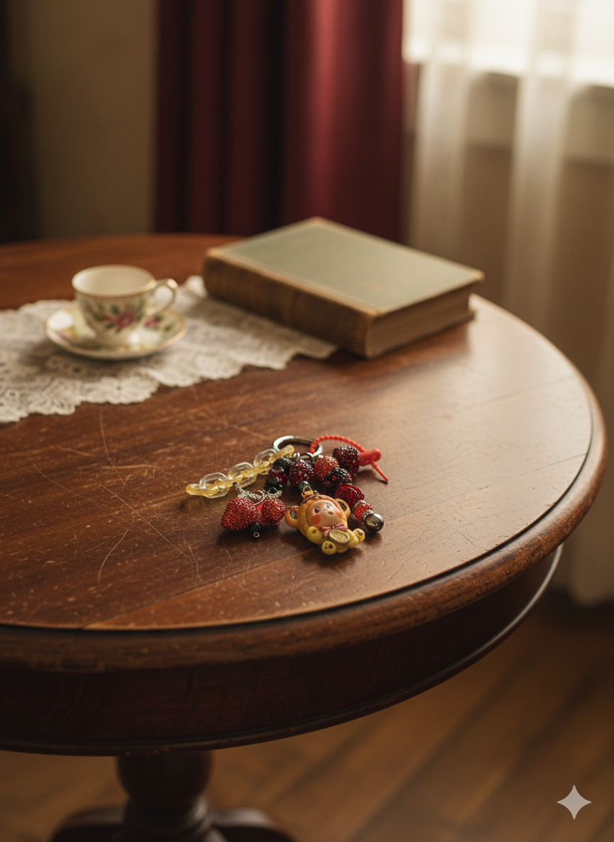 Playful & Sweet Whimsical Dessert Charm Keychain! 🍓 This adorable accessory features a sweet character, glittering berry charms, and a medley of sparkling beads in rich red, black, and amber tones. A perfect, playful accent for your keys or bag.