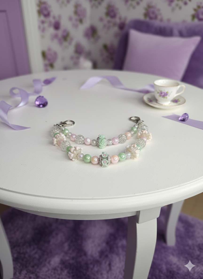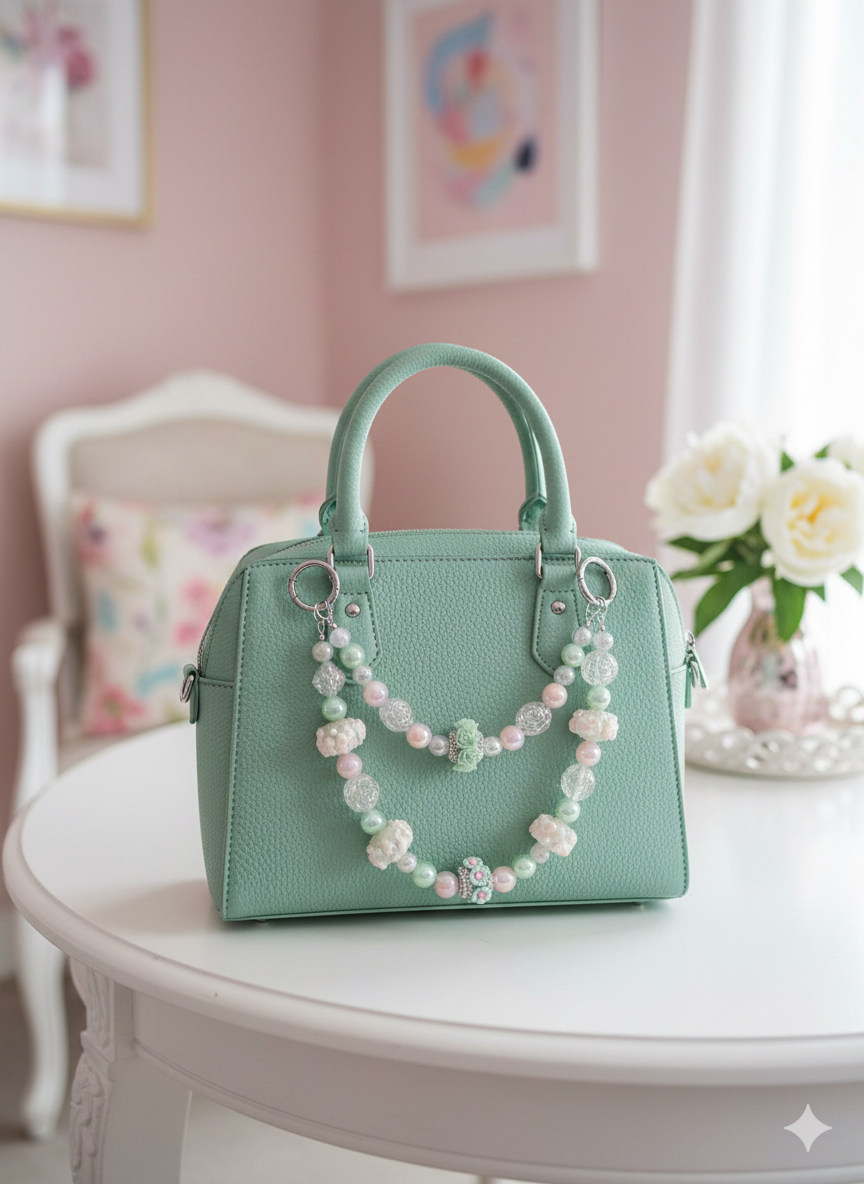 Add a touch of floral elegance to your favorite handbag This handcrafted double-strand charm features a dreamy palette of mint green, soft petal pink, and iridescent pearls. Detailed with intricate rose-bud beads and textured frosted glass, this piece is finished with high-quality silver-toned clasps for easy attachment.
